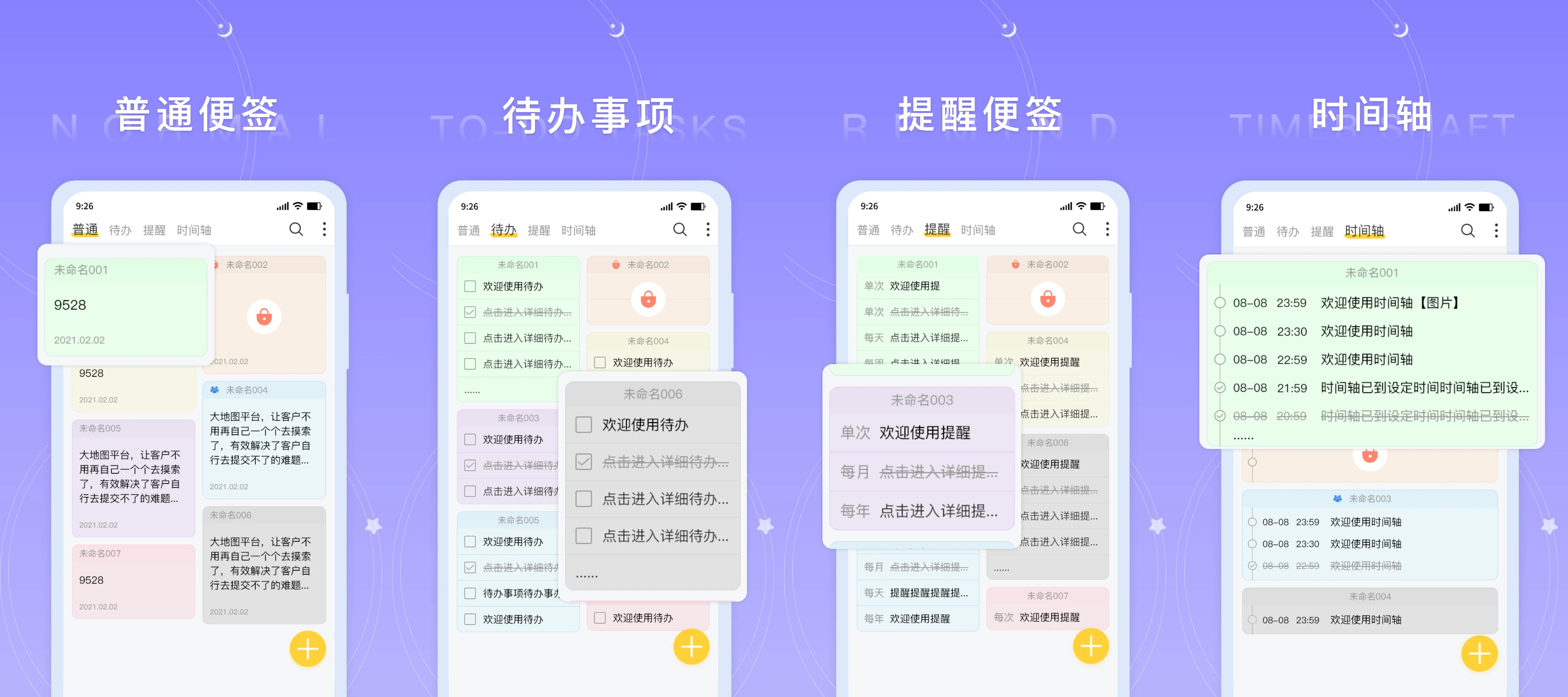 1:集成四种便签,普通文本便签、待办事项清单、提醒便签、时间轴便签,满足您的全部所需;
