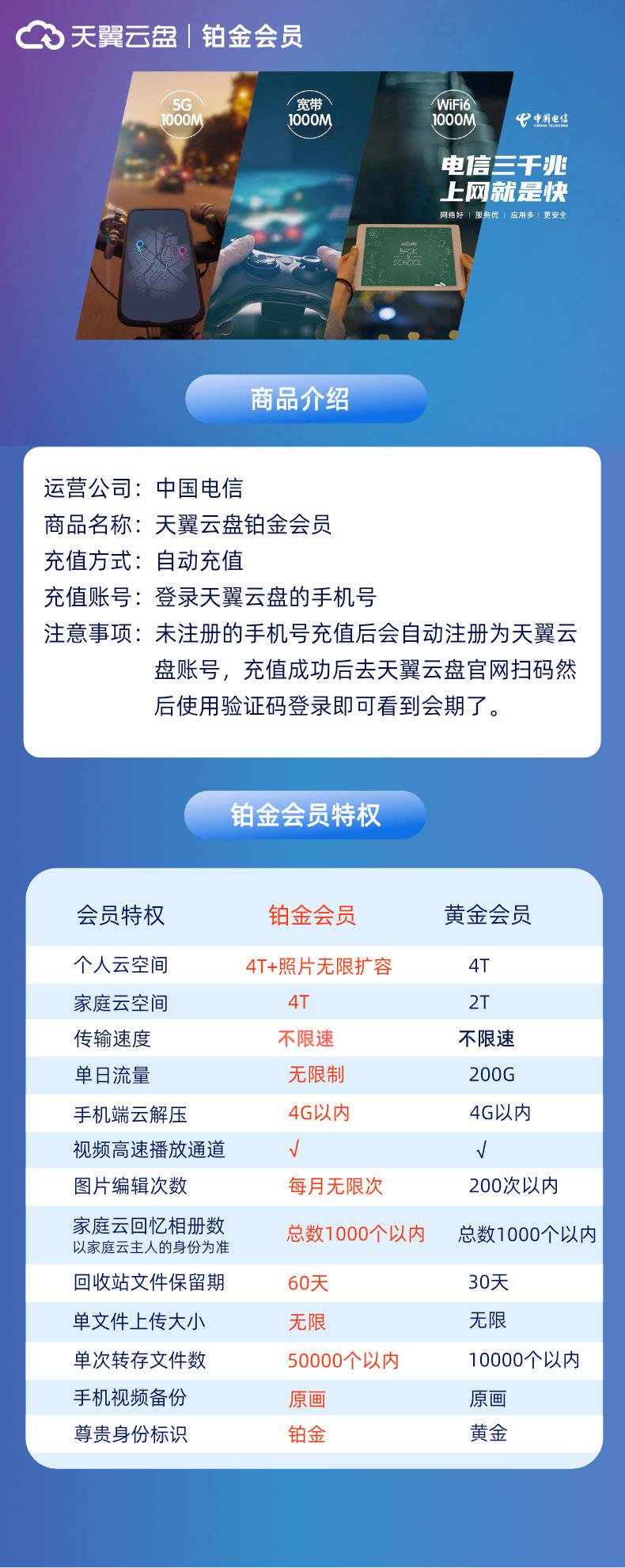 【账号直充】天翼云盘铂金会员『6个月』