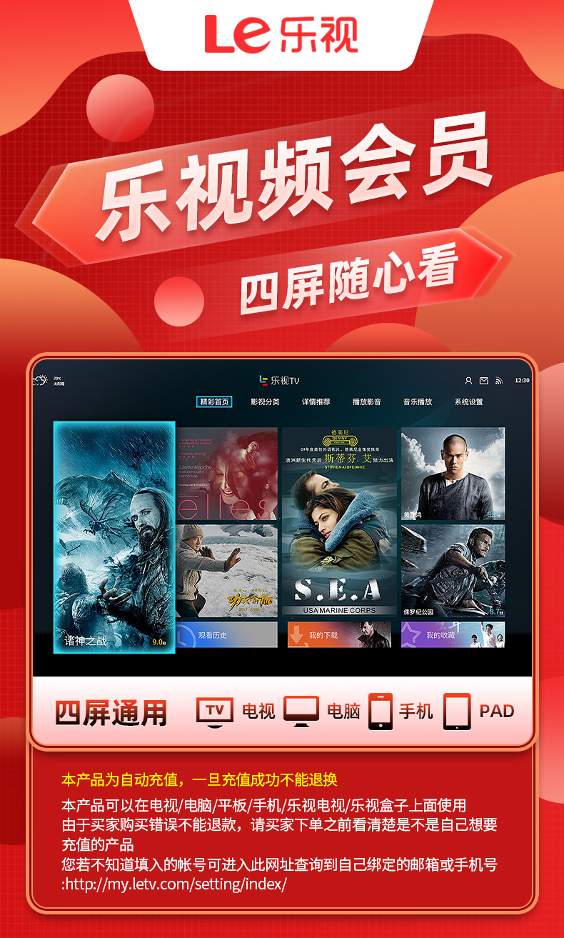 【官方直充】乐视超级影视会员『1个月』